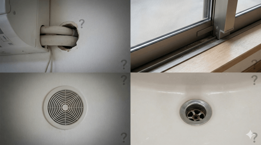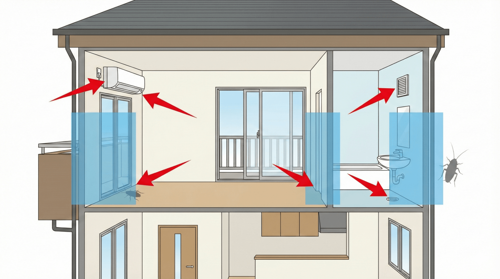 配管まわりのパテが劣化していると、ほんのわずかな隙間でも侵入口になります。ゴキブリは大きい個体だけが問題ではありません。幼虫や小型種なら、信じられない隙間を抜けます。さらに厄介なのが、壁の中に空間がある家です。壁内を通って、エアコン背面から「ひょっこり」出てくることがあります。これは“魔法”ではなく、壁内(ウォールボイド)や配線・配管の通り道が、虫にとっての通路になっているだけです。