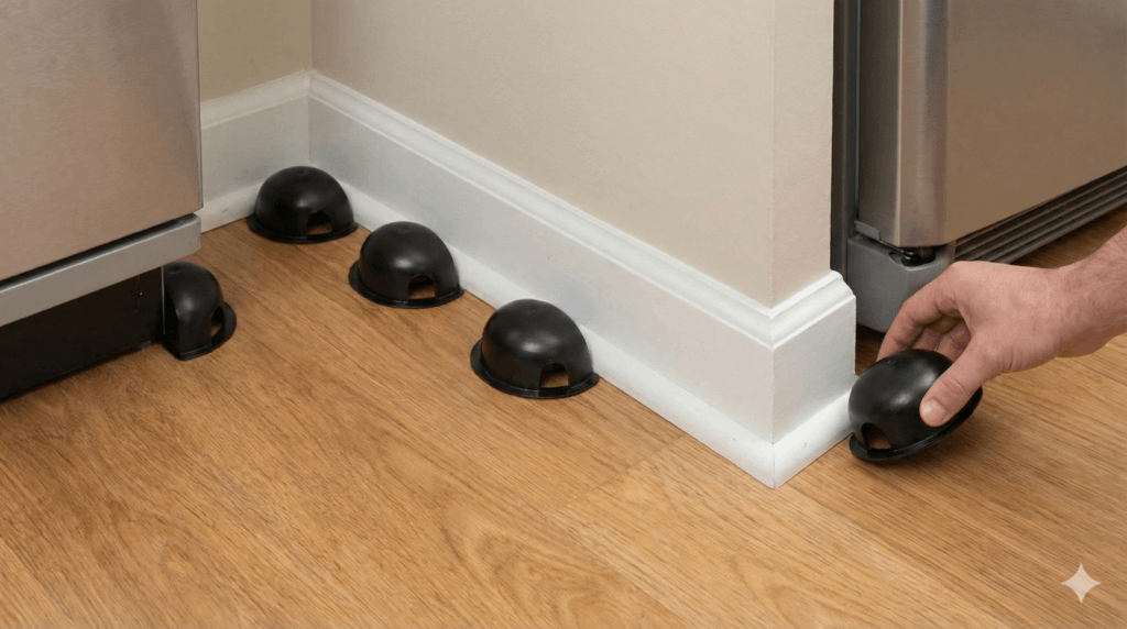 再発を止めるうえで、ベイト剤(毒餌)は強い味方です。ブラックキャップの置き方のコツは「見かけた場所に置く」だけではなく、通り道に置くこと。ゴキブリは壁際や物陰を沿って動くので、そこに設置すると当たりやすくなります。私はこれを「壁沿い理論」と呼んでいます。広い床の真ん中に置くより、壁際・家具の陰・出入口の角に置く方が、遭遇率が上がりやすいからです。