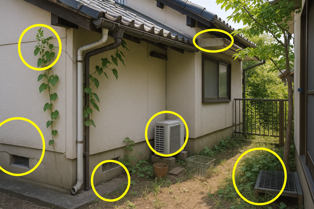 私は点検時、床下換気口、配管の貫通部、基礎のひび、屋根の破れ、雨樋・フェンス・植栽が橋渡しになっていないかを順番に見ます。