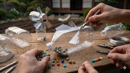 アルミ缶が「キーン」という高い金属音を出すのに対し、ペットボトルは「カタカタ」「コトコト」といった、より低く重量感のある振動を発生させます。これは地中の深い場所まで届きやすく、大型のモグラに対しても有効です。製作時には、丸型よりも六角形や八角形のボトルを選ぶのがコツです。角の部分を目安にして羽根を切り開くことで、工作の正確性が増し、風を捕らえる効率が格段に向上します。