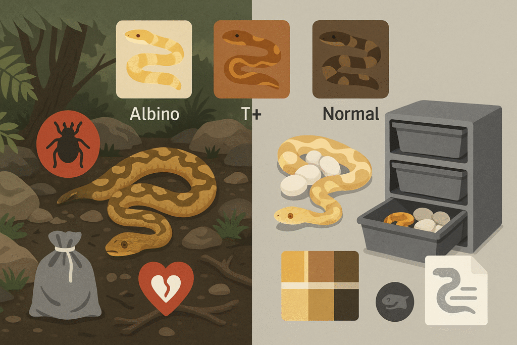 アルビノ(T-)か、淡いカラメル調のT+アルビノか、あるいはハイポアルビノなどのコンボかは、見た目の好みと繁殖計画の整合で決めます。