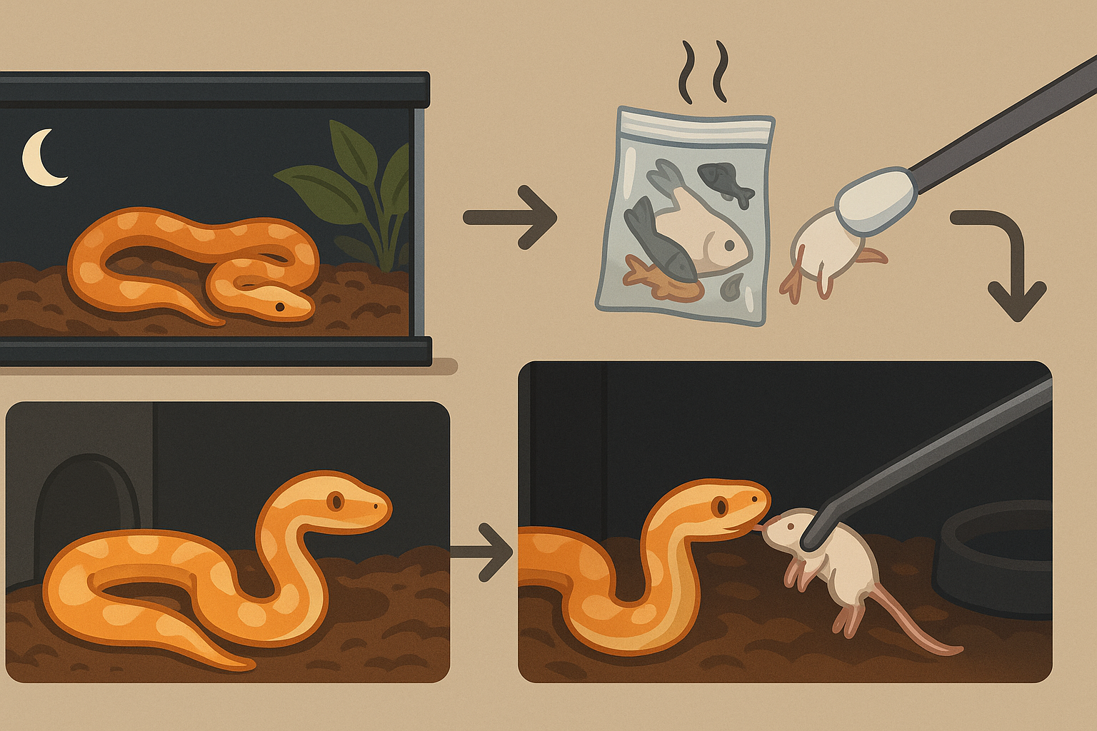 - 捕食成功後は毎回匂いを薄め、最終的に冷凍マウス単独へ移行
