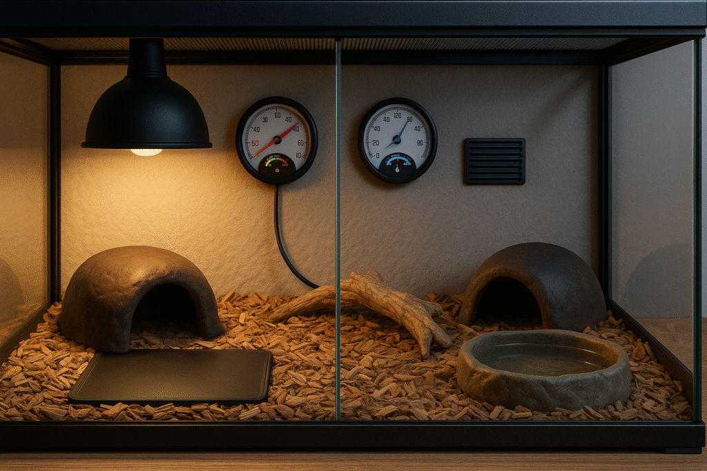 ホットスポット30~32℃、クール側24~26℃、湿度50~70%を一般的な目安として、季節と個体の様子で微調整します。