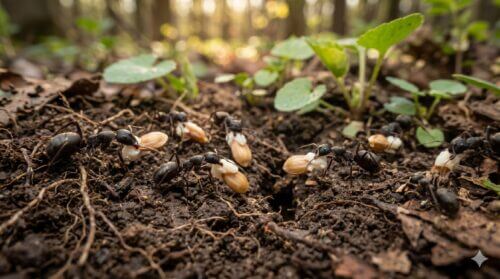 植物の中には、蟻に種を運んでもらうために進化を遂げたものが存在します。種子に「エライオソーム」と呼ばれる蟻の好物(脂肪分や糖分)を付着させ、それを目当てに集まった蟻が種を巣まで運ぶ仕組みです。この現象は「ミルメココリー(蟻散布)」と呼ばれ、カタクリやスミレなど、多くの身近な植物がこの戦略をとっています。蟻は美味しい部分だけを食べ、種本体は巣の近くの栄養豊かな土壌に捨てます。