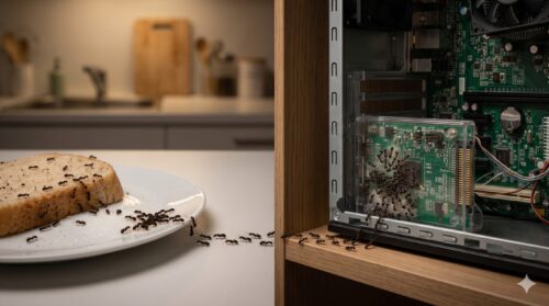 さらに現代社会において深刻なのが電子機器への物理的被害です。ルリアリなどの一部の種は、電子機器が発生させる磁場や微細な熱、あるいは配線に使用される機械油やプラスチック成分の匂いに強く誘引される習性があります。コンセントの内部や、給湯器の制御基板、デスクトップパソコンの内部などに営巣すると、その分泌物や死骸が回路をショートさせます。