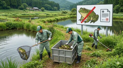 もし庭にウシガエルが現れ、それを捕まえて「可哀想だから遠くの池に放してあげよう」と移動させると、それは法律違反となり、重い罰金(個人で最大300万円)や懲役刑が科せられる可能性があるのです。私たちができる最大の防除は、彼らが住み着きやすい環境(止水域や深い草むら)を作らないこと。