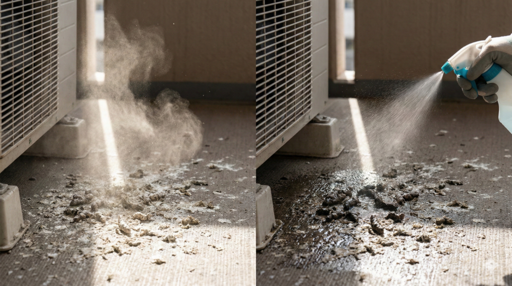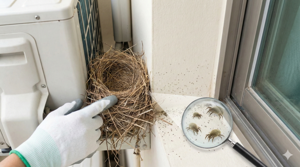 ベランダ、室外機周り、手すり、窓枠の溝などに乾燥した糞が溜まると、掃除の動作(ほうき、ブラシ、エアダスター)で微粒子が飛び、吸い込みのリスクが上がります。