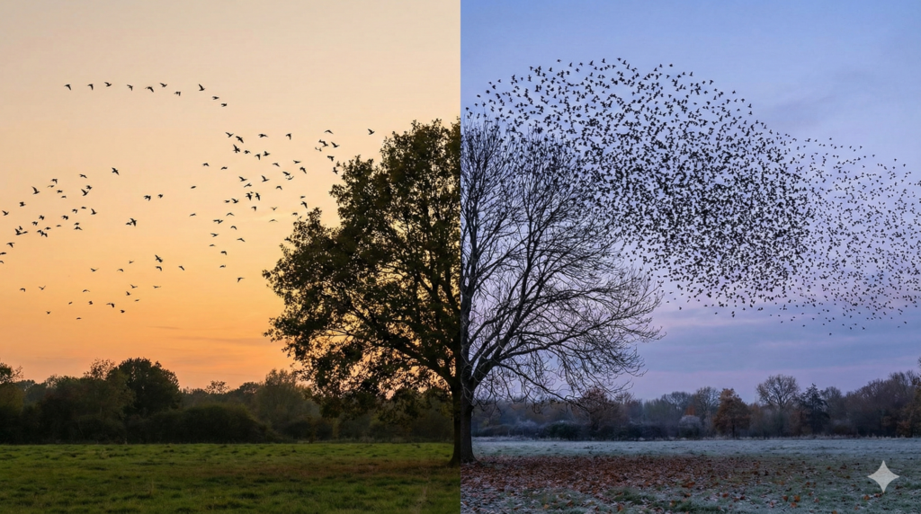 理由は単純で、繁殖期が落ち着くと、つがいや小群が“巨大な群れ”へ合流し、ねぐらが大規模化するからです。