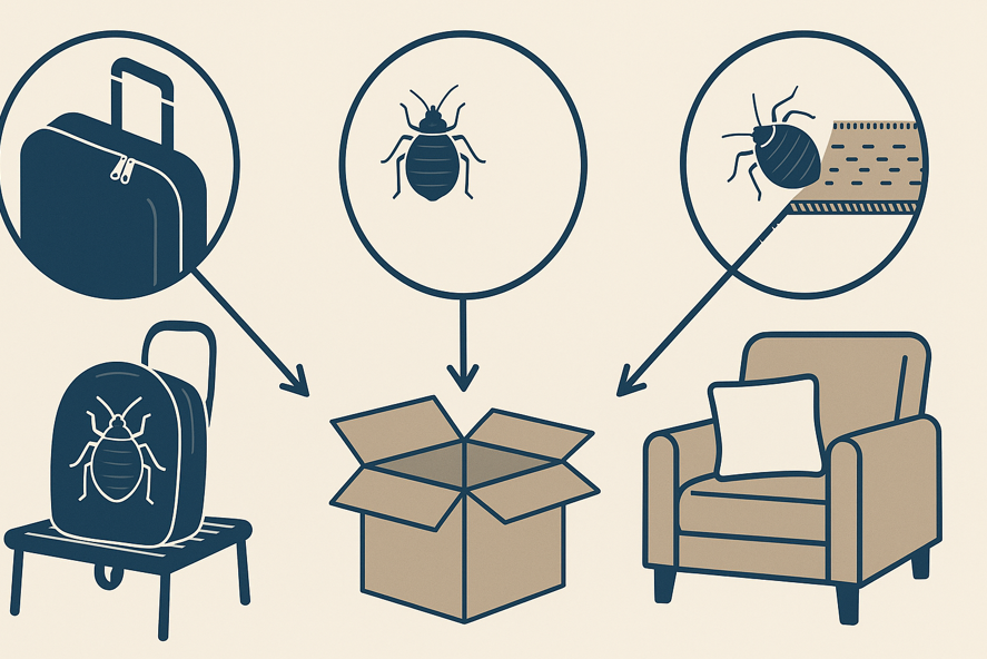 国内外の旅行客のスーツケース、段ボール、家具の隙間に付着し、宿泊施設や集合住宅で繁殖が始まる流れが典型例です。
