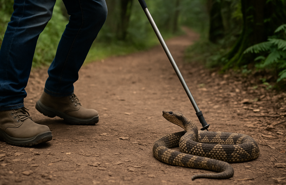 ヘビを追い払おうと棒でつつく行為は、防衛攻撃のトリガーになりやすく、最も避けるべき行動です。
