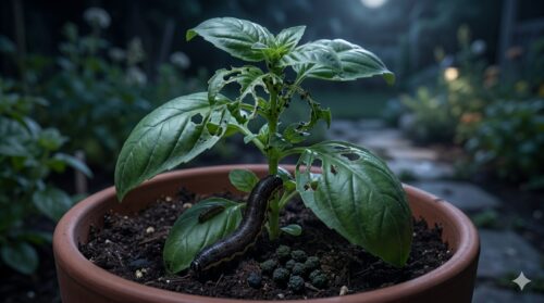 朝、バジルの様子を見に行って愕然とする……。昨日まであんなに青々と茂っていた葉が、一夜にして芯だけにされ、周囲には直径数ミリの巨大な黒い糞が転がっている。そんな「バジル強盗」のような仕業の主犯は、ヨトウムシ(ヨトウガの幼虫)です。