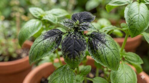 これまでは「虫」そのものや「糞」について解説してきましたが、最後に解説するのは「病気」による黒色化です。バジルの葉の表面が、まるで黒い煤(すす)を被ったように汚れている場合、それは「すす病」という真菌性の病気です。この現象には、これまでに紹介したアブラムシなどの害虫が深く関わっています。