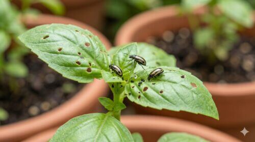 この虫の最大の特徴は、その名前の通り、危険を察知するとノミのようにピョンと跳ねて逃げることです。バジルの株に手を近づけた瞬間に、黒い小さな粒が弾けるように飛び散ったら、それは間違いなくこのハムシです。成虫はバジルの葉を好み、円形の小さな穴を無数に開けます。多発すると葉が網目状になり、光合成能力が低下するだけでなく、料理に使う際の見た目も著しく損なわれます。