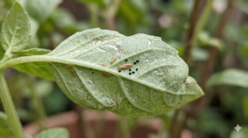 葉の裏に潜むアザミウマと黒い糞の痕跡