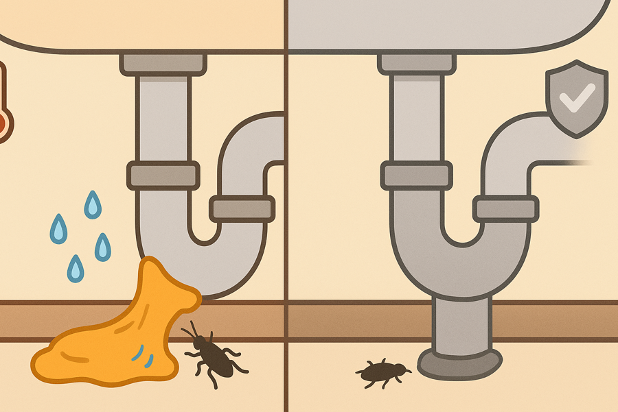 排水トラップと椀トラップは、ゴキブリの侵入を防ぐために欠かせない住宅設備の一部です。どちらも「封水」という仕組みを使って、下水からのニオイや害虫の侵入を物理的に防ぐ役割を果たしています。
