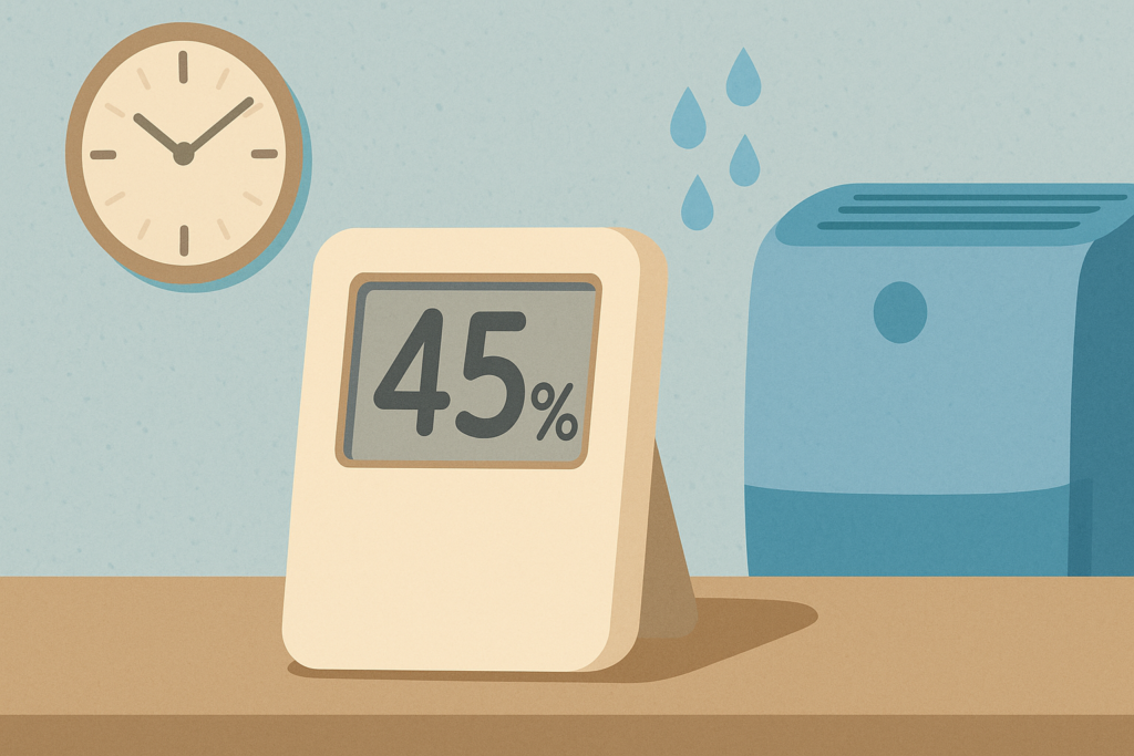 湿度計を置いて、数値で管理するのがいちばん確実です。