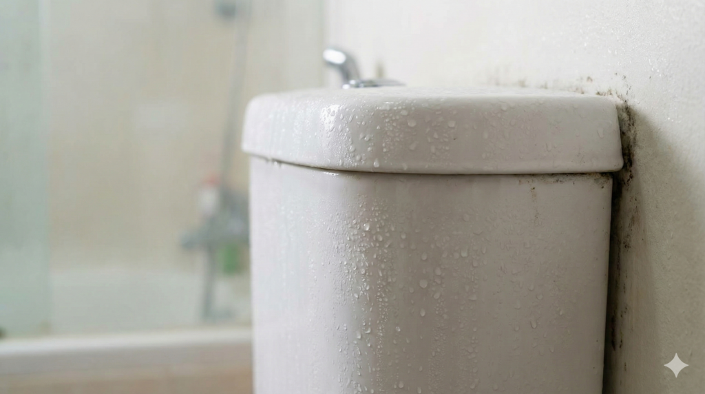 トイレの結露は、タンク内の水が冷たいほど起こりやすく、室温との温度差でタンク表面が露点に達すると水滴になります。