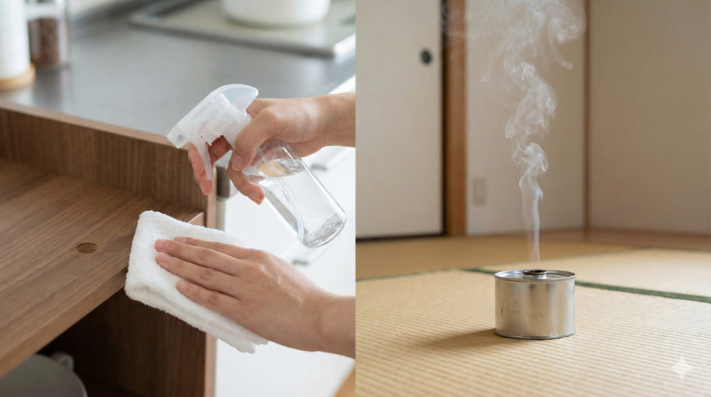 拭き掃除だけでも意味はありますが、走って逃げる個体を確実に落とすなら、まずは噴霧して動きを止め、その後に拭き取りと清掃で仕上げる流れが安定します。