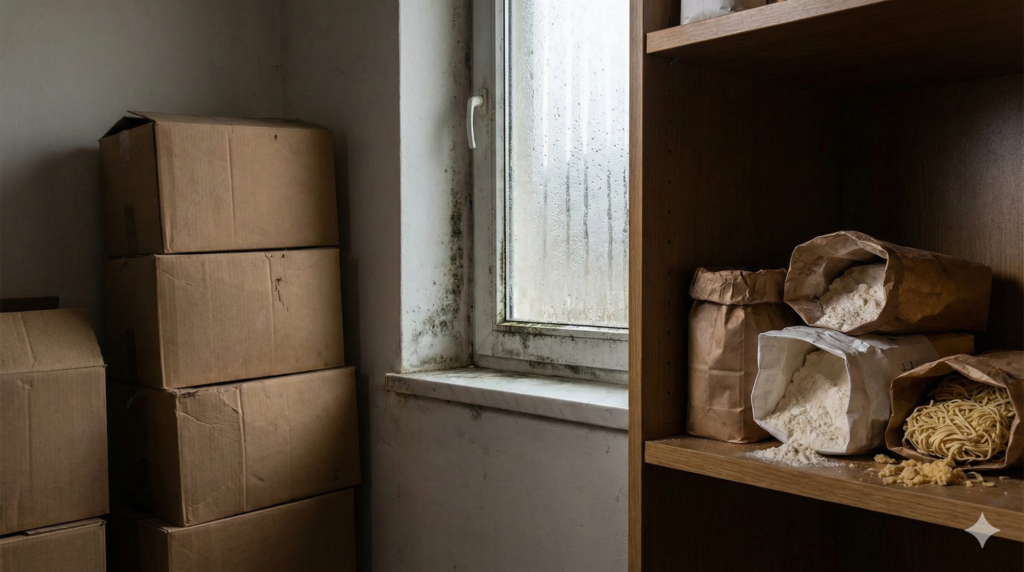 私がよく見るパターンは、段ボールの放置、押し入れの通気不足、下駄箱の湿気、窓際の結露、収納棚の粉類の管理不足などです。