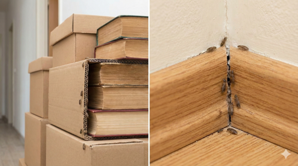 段ボール、紙袋、古本、使っていない布製品、キッチンの乾物や粉類の周辺は、微細なエサが溜まりやすいです。