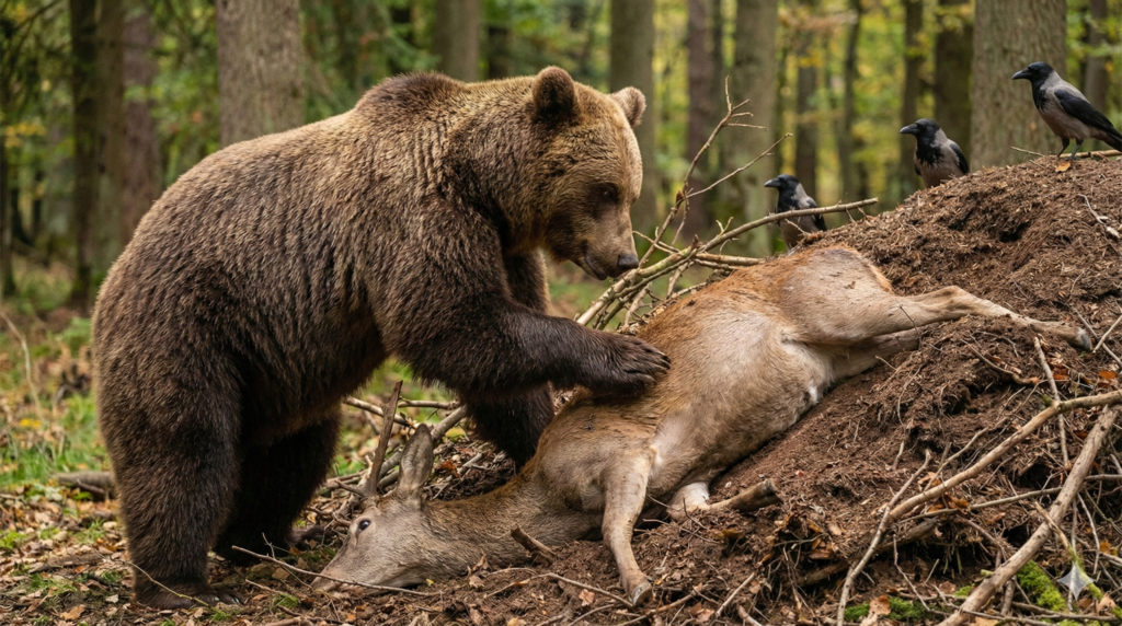 実際には、ヒグマは餌を埋めた直後から、その近くで待機し、監視する行動を取ることがよくあります。