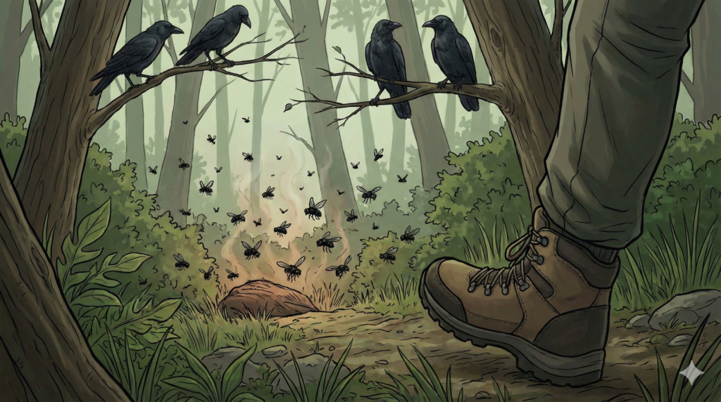 腐敗臭+ハエの羽音+カラスの騒ぎがセットでそろっている場所は、土まんじゅうまたは新鮮な死骸がある可能性が高く、ヒグマが近くにいる、あるいは戻ってくるリスクも高いと考えるべきです。