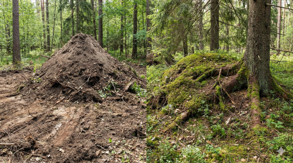 自然のアリ塚やモグラ塚、小さな崩土なども盛り上がりを作りますが、これらは一般的にスケールが小さく、周囲の地表を大きく削ってはいません。