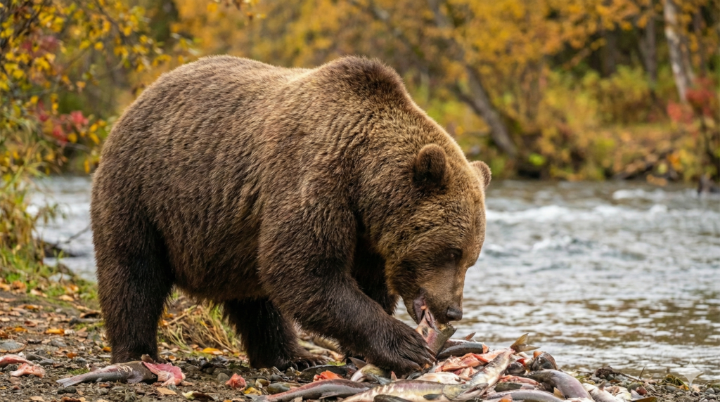 ヒグマの餌への執着は、季節ごとの食性リズムと密接に結び付いています。ヒグマは冬のあいだ冬眠(あるいはそれに近い長期休眠)を行うため、その前後の時期には体を維持するためのカロリーを集中して確保しなければなりません。