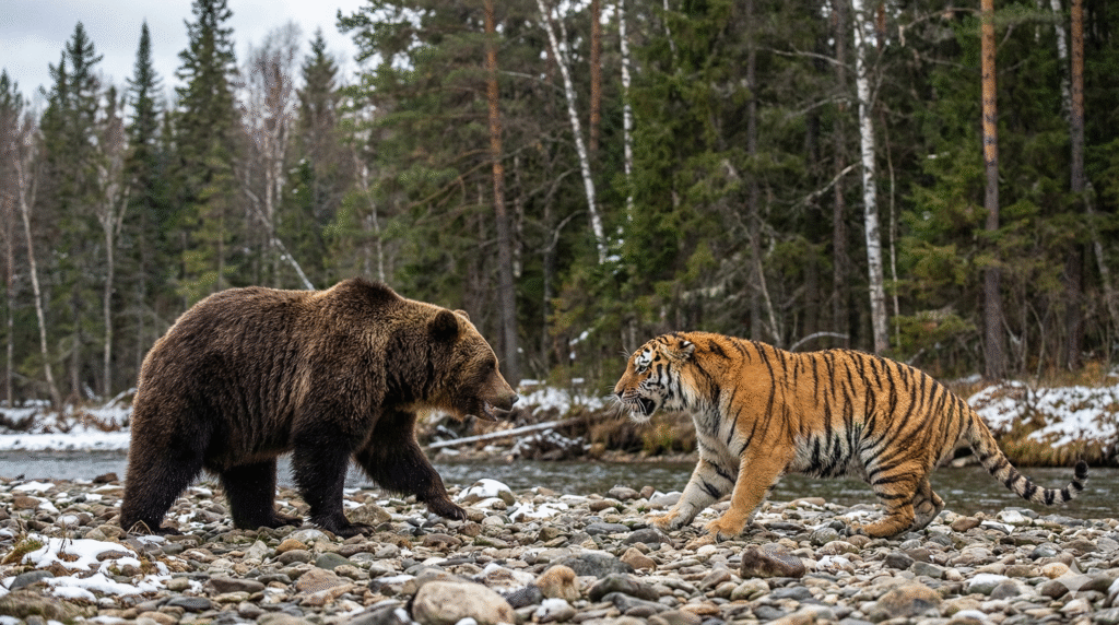 実際の生態系では、ロシア極東など一部の地域で、ヒグマとアムールトラが同じエリアに生息しており、両者の争いが記録されることもあります。