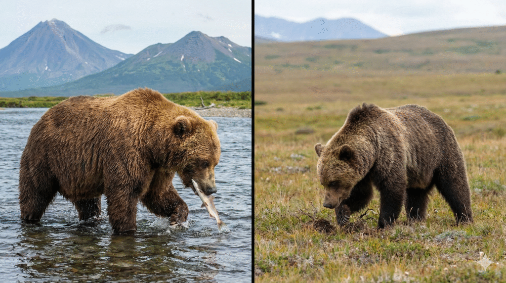 グリズリーは山岳地帯や草原を広く移動しながら、草本、根、昆虫、小型哺乳類、時に大型哺乳類まで幅広く食べますが、サケの「川が埋まる」ほどの爆発的な資源は、一部地域を除けば限られています。