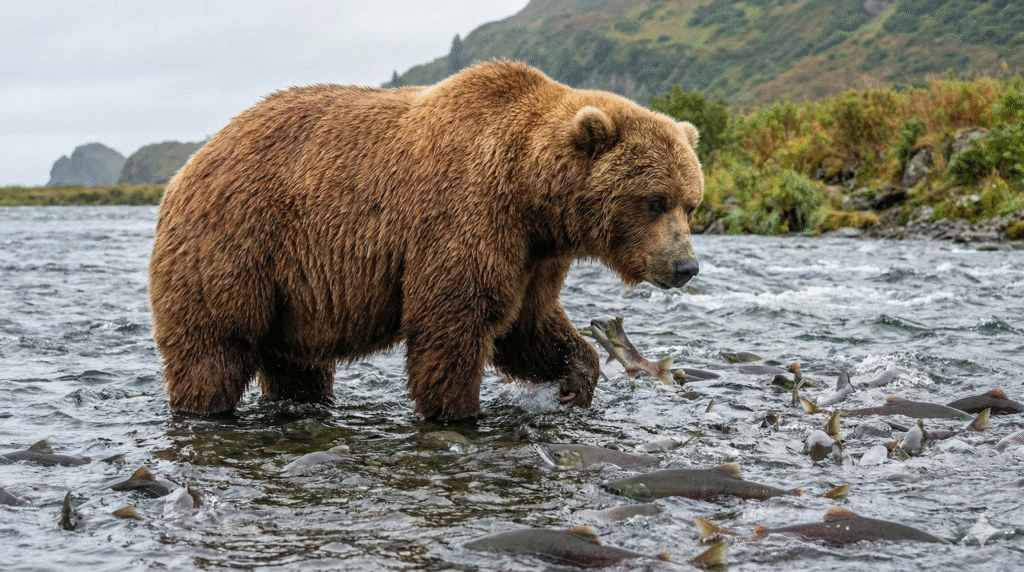 コディアック島周辺の河川では、サケの遡上シーズンになると川が銀色に埋まるほど魚が集まり、ヒグマはほとんど動かずに次々とサケを捕まえることができます。