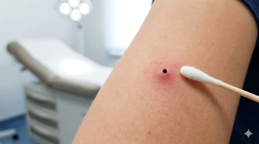 黒い点が残っている、引っ張ったら本体だけ取れて先端が見えない。この場合は、口器や一部が皮膚内に残っている可能性があります。ここで針や毛抜きを持ち出して掘り返すのは、私はおすすめしません。傷口を広げてしまい、二次感染や炎症を強めやすいからです。