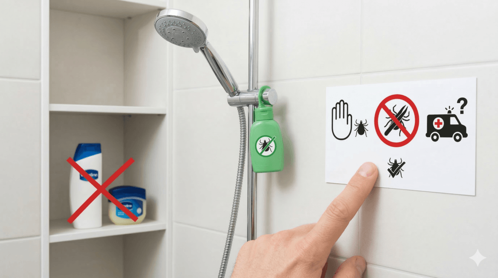 厚生労働省の啓発資料でも、マダニに咬まれたときは無理に引き抜こうとせず、医療機関で処置を受けるよう案内されています。人間が読める参照元としては、出典:厚生労働省「ダニにご注意ください」です。私はこの考え方を現場目線でも強く支持しています。お風呂は、すでに食いついた個体を落とす場所ではなく、まだ吸着していない個体を洗い流し、全身を落ち着いて観察する場所として使うほうが合理的です。