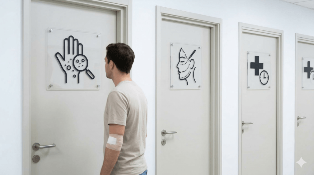 基本は皮膚科を第一候補に考えてください。皮膚の処置と、その後に起こりうる発疹や炎症の評価までつなげやすいからです。顔や首など傷あとをできるだけ目立たせたくない部位では、形成外科が選択肢になることもあります。