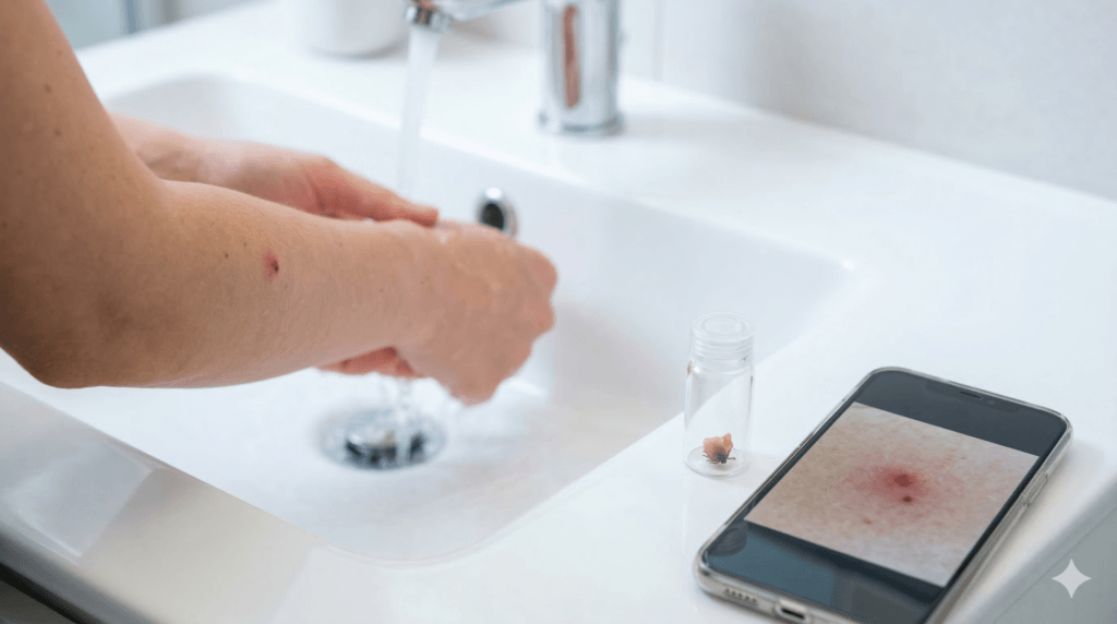 すでに取ってしまった場合は、まず深呼吸して状況整理です。患部を流水でやさしく洗い、こすりすぎないようにしてください。そのうえで、取れたと思っても皮膚内に一部が残っていないか、腫れや痛みが急に強くなっていないか、写真を撮って記録しておくと受診時に役立ちます。ここで大切なのは、「自分で取ってしまったからもう病院には行きにくい」と考えないことです。むしろ、触ったからこそ医師に見てもらう意味が出てきます。