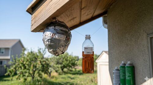 もう一つの面白い対策が「ダミーの巣」です。新聞紙を丸めてガムテープで固定し、バレーボール大の球体を作って吊るしておきます。スズメバチの女王蜂には強い縄張り意識があり、先に大きな巣がある場所には営巣を避ける傾向があります。これを逆手に取った方法です。また、市販の忌避スプレーを3月下旬から散布しておくことも、蜂の巣のでき始めを阻止する上で非常に有効な手段となります。