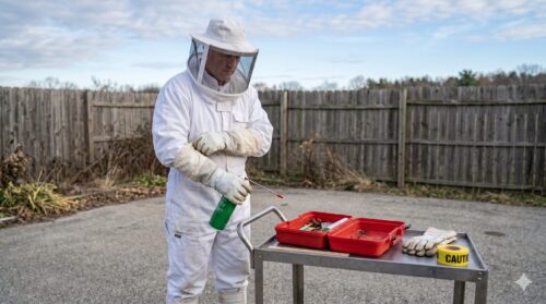 殺虫スプレーと防護服で安全を最優先に確保