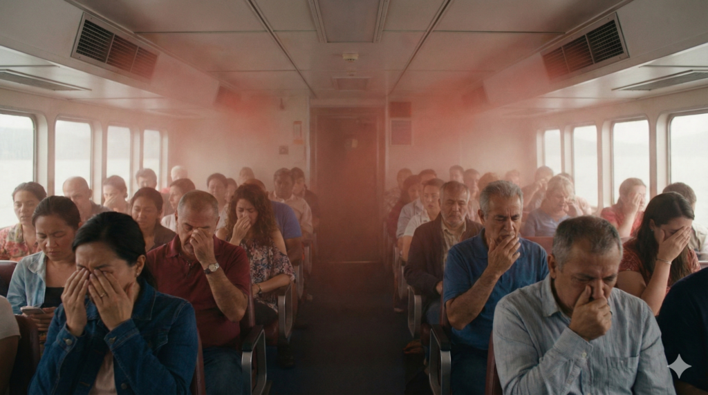 操舵室で視界が奪われる、咳き込みが止まらないといった状況になれば、フェリーの安全運航そのものが危うくなります。