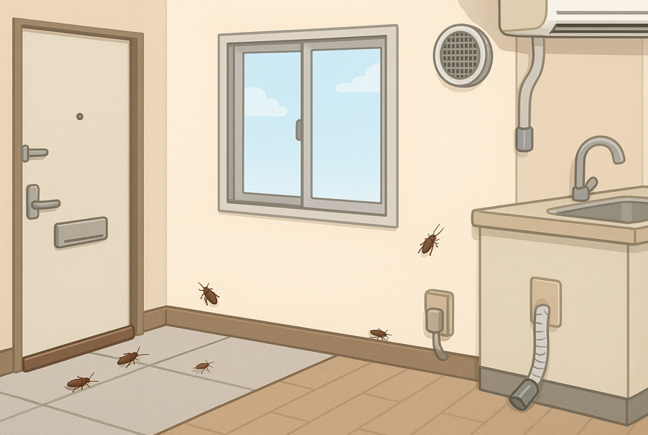 建築物理の観点では、冷暖房運転や外気温差による煙突効果(スタックエフェクト)で上下階へ空気が移動する際、気密性が低い貫通部・隙間が残っていると、害虫が同ルートを利用しやすくなります。