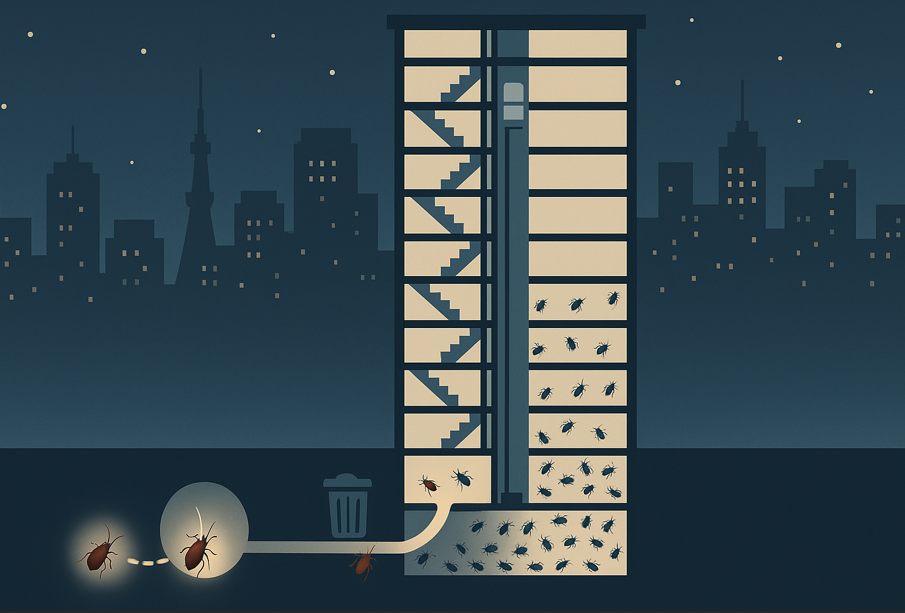 都市部の中でも東京は、人口・事業所・交通・物流が高度に集積し、深夜まで稼働が続くエリアが多いため、餌資源(食品残渣や油分)と潜伏場所(設備機器の背後、配管周り、共用部の隙間)が恒常的に供給されやすい環境です。
