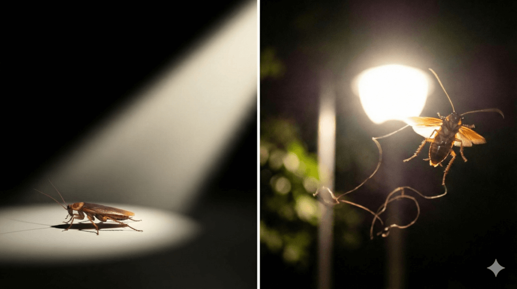ゴキブリは基本的に負の走光性、つまり明るい場所を避けて暗所へ逃げる性質が強いです。台所で電気をつけた瞬間にサッと隠れる、あれが典型例ですね。これは「光が嫌い」というより、明るい場所は捕食者に見つかりやすく、身を守れないから避ける、という生存戦略に近い反応です。