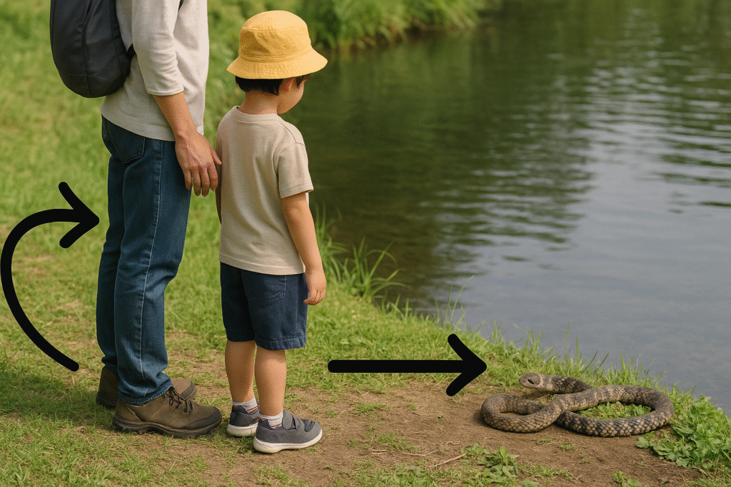 特に子どもには、「小さいヘビでも触ってはいけない」「見つけたら大人に知らせて、そっとその場を離れる」というルールを徹底しておくことが重要です。