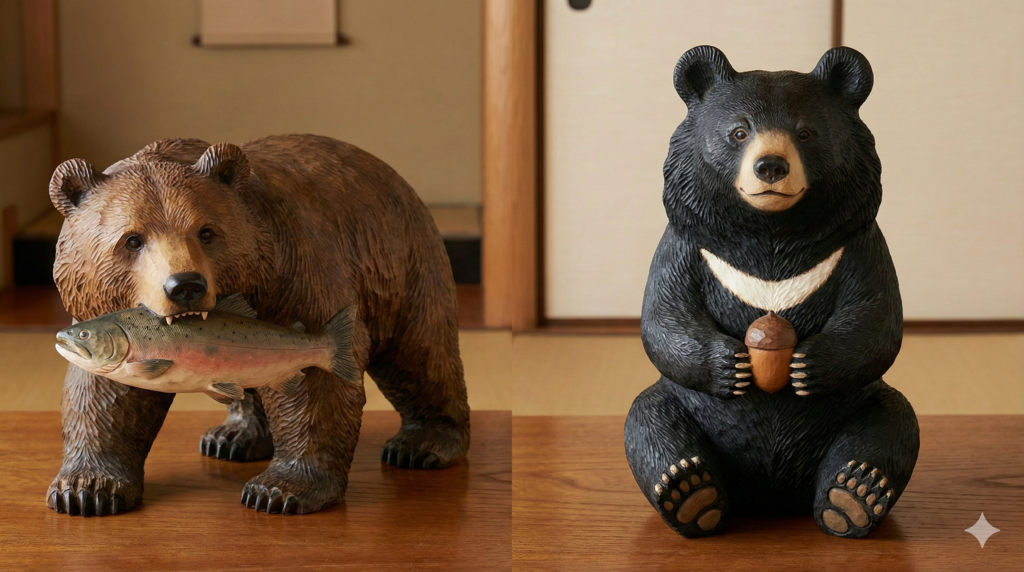 • 木彫り熊のモデルは基本的にヒグマであり、ツキノワグマではない