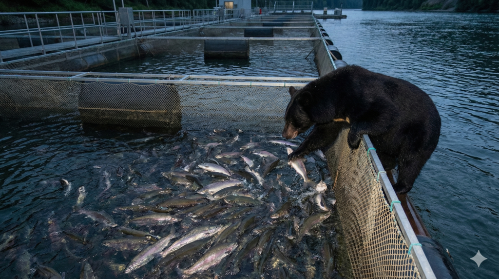 生け簀の中に高密度で魚が集められている環境は、クマから見れば「逃げにくい獲物が大量にいる場所」です。
