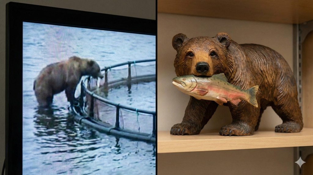 工芸の歴史を冷静にたどっていくと、「熊=鮭」イメージは、自然生態そのものではなく観光と商業の中で強調された記号であることが分かってきます。