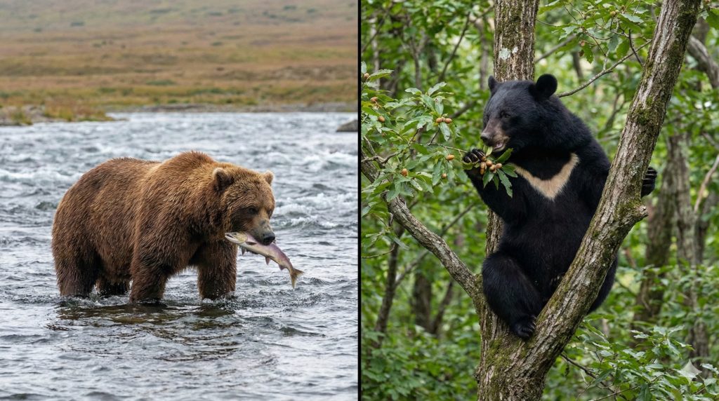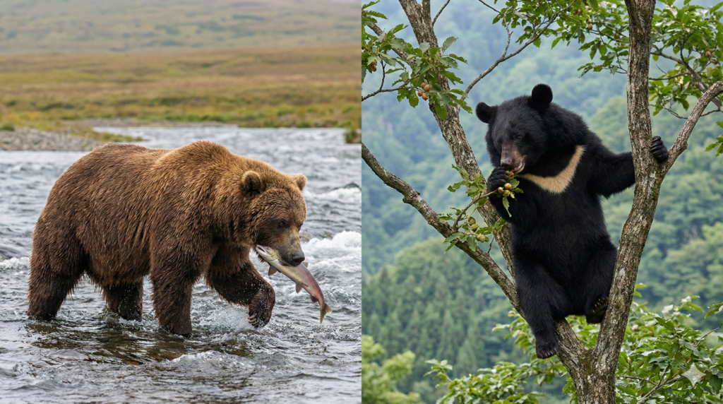 ヒグマは大きな体と筋力で浅瀬の鮭を押さえ込み、脂質の多い身や卵を集中的に食べる一方で、ツキノワグマは木に登る能力を武器に、ドングリや果実を主なエネルギー源にしています。