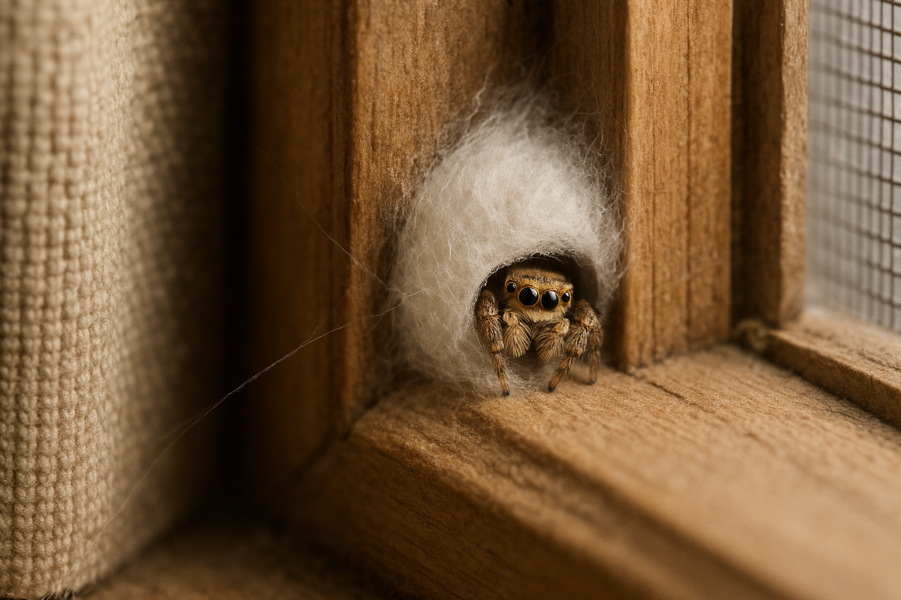 これらの経路を小昆虫が利用し、その後を追う形でハエトリグモが屋内に定着することがあります。活動時間は日中が中心で、日射のある窓辺や白い壁面など、コントラストが高く視認性のよい面を好んで探索します。