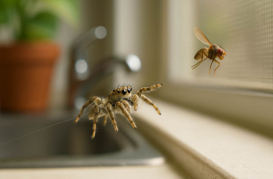 網で待ち構えるのではなく、日中に活発に歩き回って探索するため、窓辺や明るい壁に留まるハエを狙いやすい環境が好相性です。