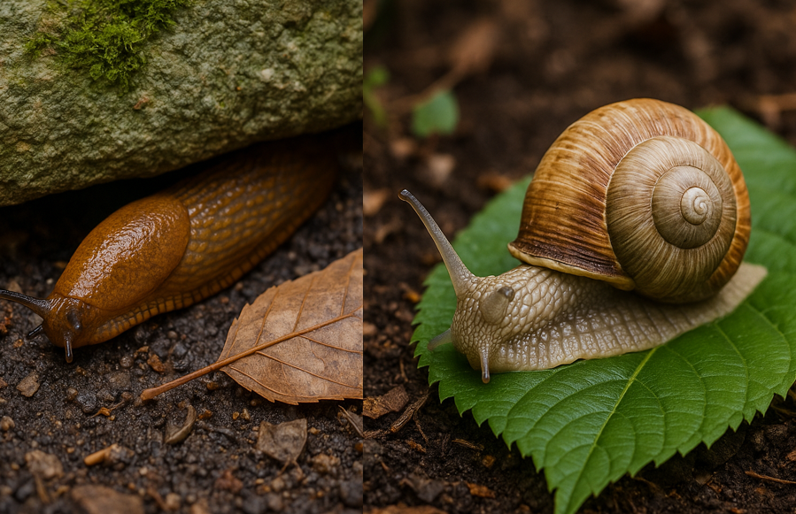 両者は陸生の腹足類で近縁ですが、最も大きな違いは外殻の有無です。