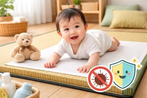 また、赤ちゃんのいる家庭では、ダニ対策の目的が「刺され対策」だけでなく、「アレルゲン対策」まで広がることがあります。だからこそ、強い成分を増やすことより、部屋を清潔に保つことのほうが重要になる場面が多いです。畳の上に防ダニシートを敷く場合も、製品の安全表示を確認し、においが強くないか、寝具や遊び場の近くで使用できる設計かをよく見てください。とくに赤ちゃんが長時間過ごす部屋では、換気のしやすさと掃除のしやすさを優先したほうが安心です。